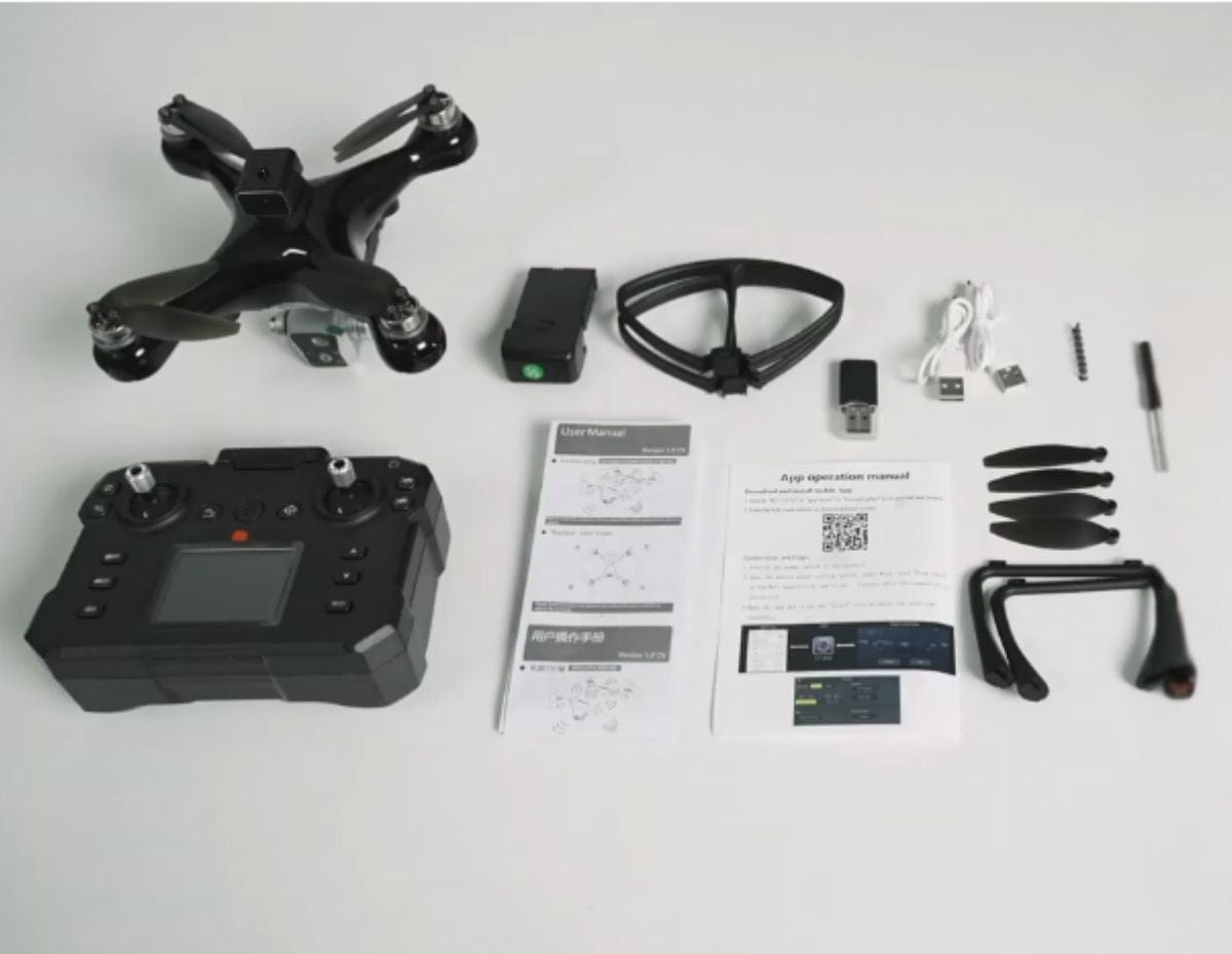 Tout est inclus : drone, télécommande avec écran, batterie, carte mémoire et accessoires.