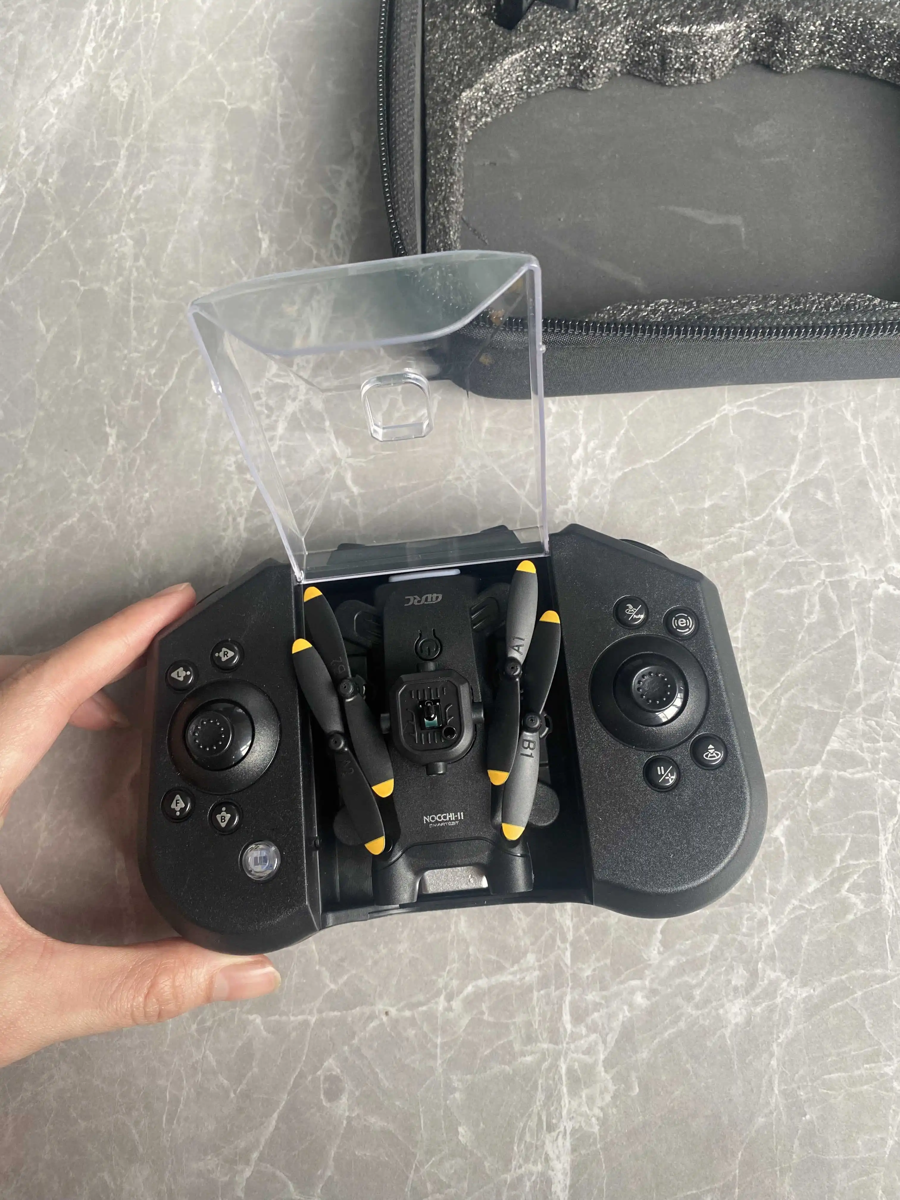 • Drone pliable qui se range directement dans sa télécommande pour un transport facile.